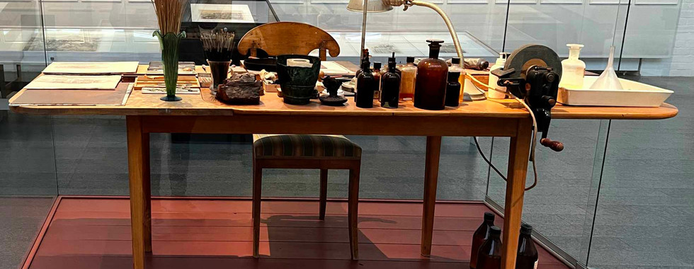In addition, the museum's graphic exhibition is also impressive. The Falugrafikerna exhibition showcases the works of Helge Zandén, Bertil Bull Hedlund, Stig Borglind, David Tägtström, and Hans Norsbo, as well as Axel Fridell's graphic works. Special attention was given to Axel Fridell's "Mr Simmons (The Reader)" graphic, which was featured in one of Sweden's most renowned graphic magazines. The exhibition also displayed stands and tools from Stig Borglind's studio, illustrating the process of graphic work in the past. (It would be great to have an artist's table without cats... :) The exhibition offered insights into the history of European graphic techniques, including some rare treasures.